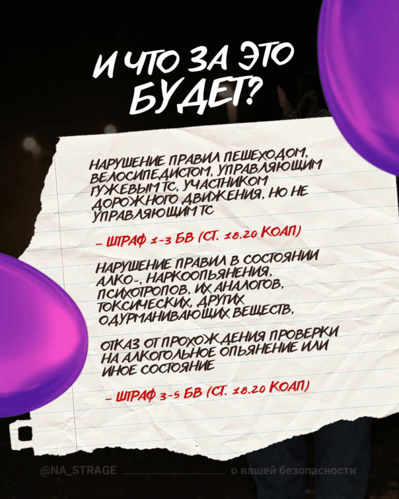 — нарушение правил дорожного движения пешеходом (лицом, управляющим СИМ) в состоянии алкогольного опьянения или состоянии, вызванном потреблением наркотических средств, психотропных веществ, их аналогов, токсических или других одурманивающих веществ, влечёт наложение штрафа в размере от трех до пяти базовых величин.