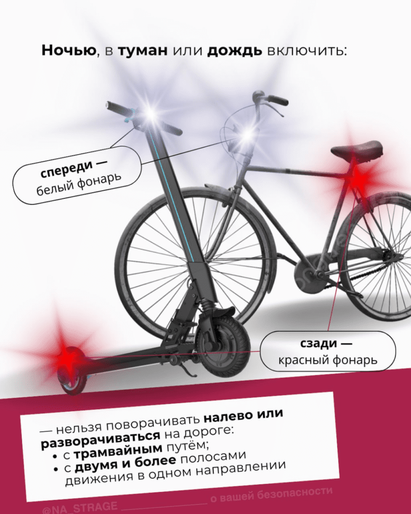 🛴При движении в темное время суток на велосипеде или СПМ нужно включить белый фонарь спереди и красный сзади, надеть одежду повышенной видимости.