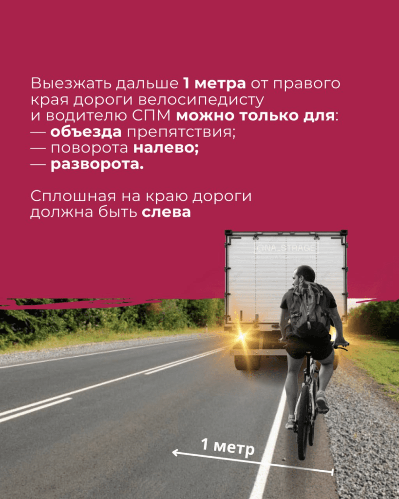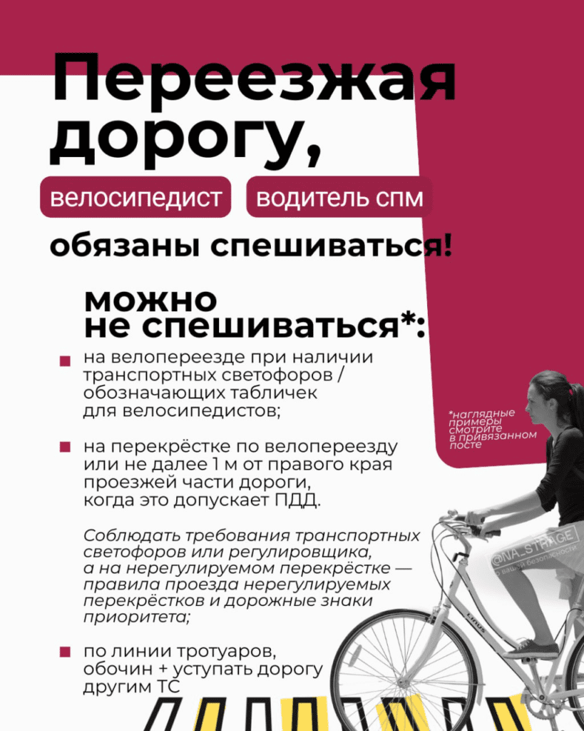 ✔️при пересечении проезжей части водители СПМ и велосипедисты обязаны спешиться;